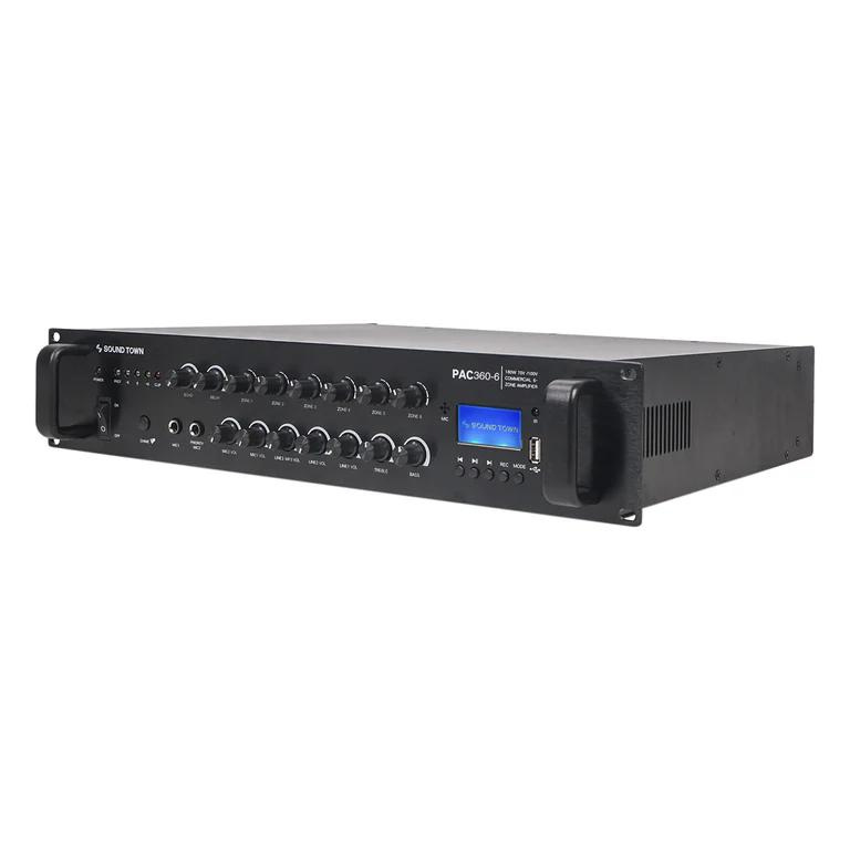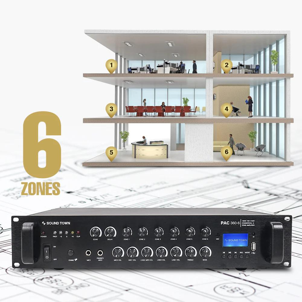 Tăng âm 360W PAC360-6 zone - Sound Town: Là bộ khuếch đại công suất 360W có thể gắn trên tủ Rack tiêu chuẩn 19" với chức năng quản lý 6 vùng loa. Bộ tăng âm này có chức nâng tích hợp giới hạn an toàn bảo vệ loa và bộ khuếch đại không bị quá nóng. Ngoài ra với tùy chọn trở kháng: 70 volt, 100 volt, 8 ohm và 4 ohm. Rất lý tưởng cho các ứng dụng như nhà hàng, quán bar, quán rượu, trường học và nhà xưởng, nhà máy...